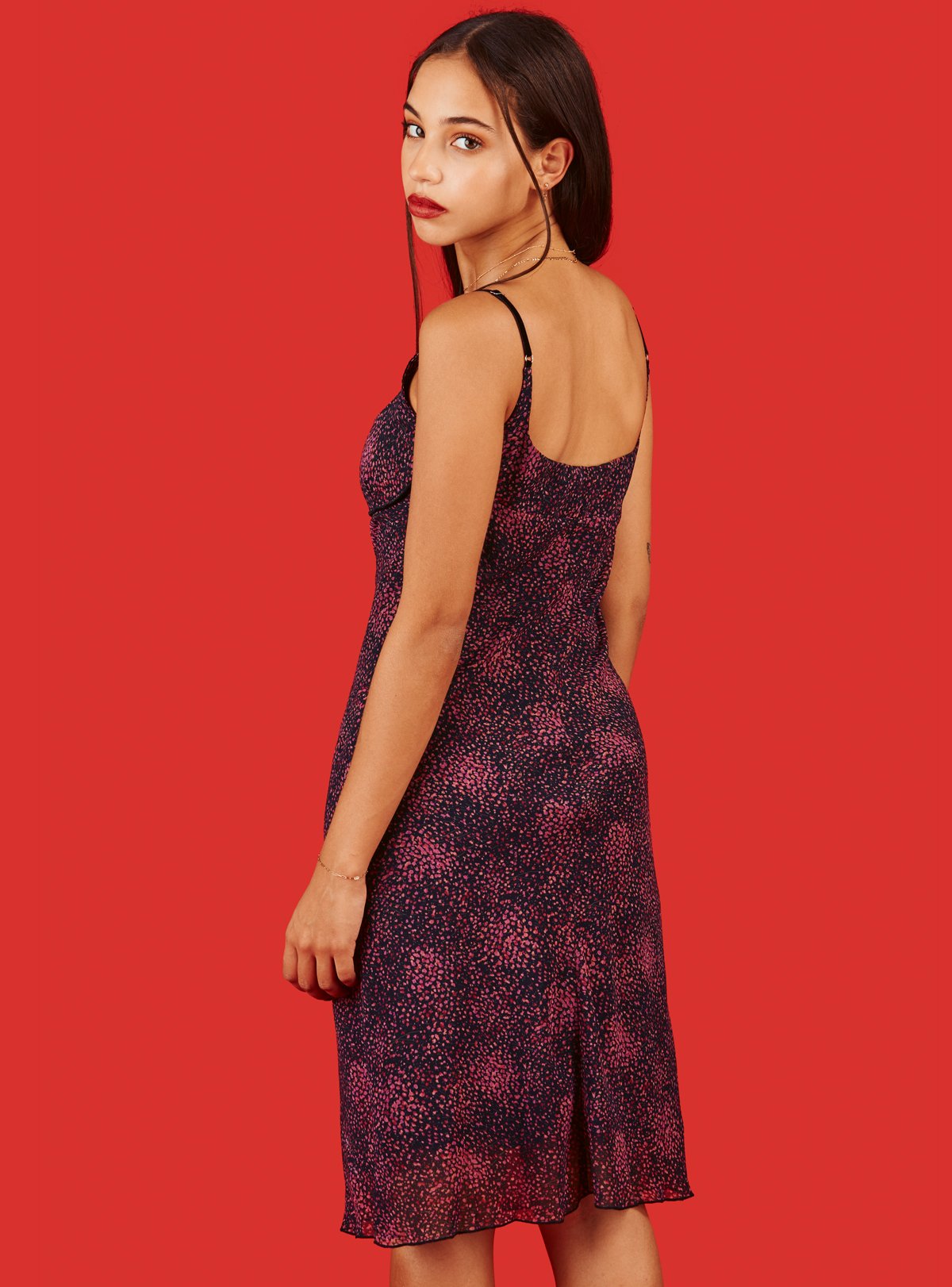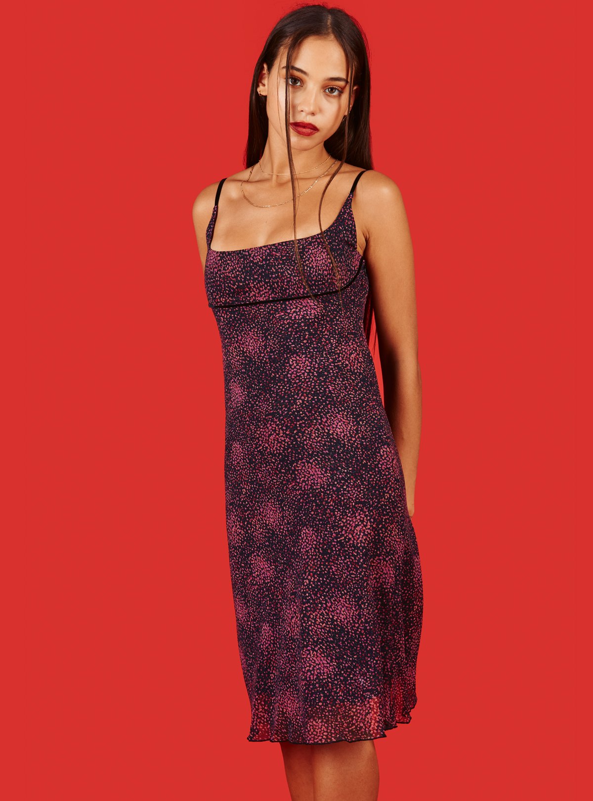 Adorable dress with velvet piping details below the bust, adjustable shoulder straps and a bias cut at the bottom.