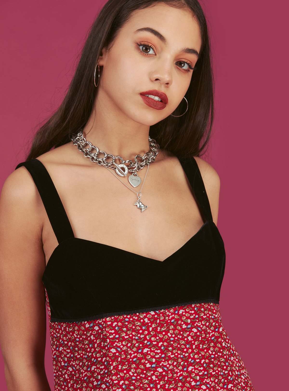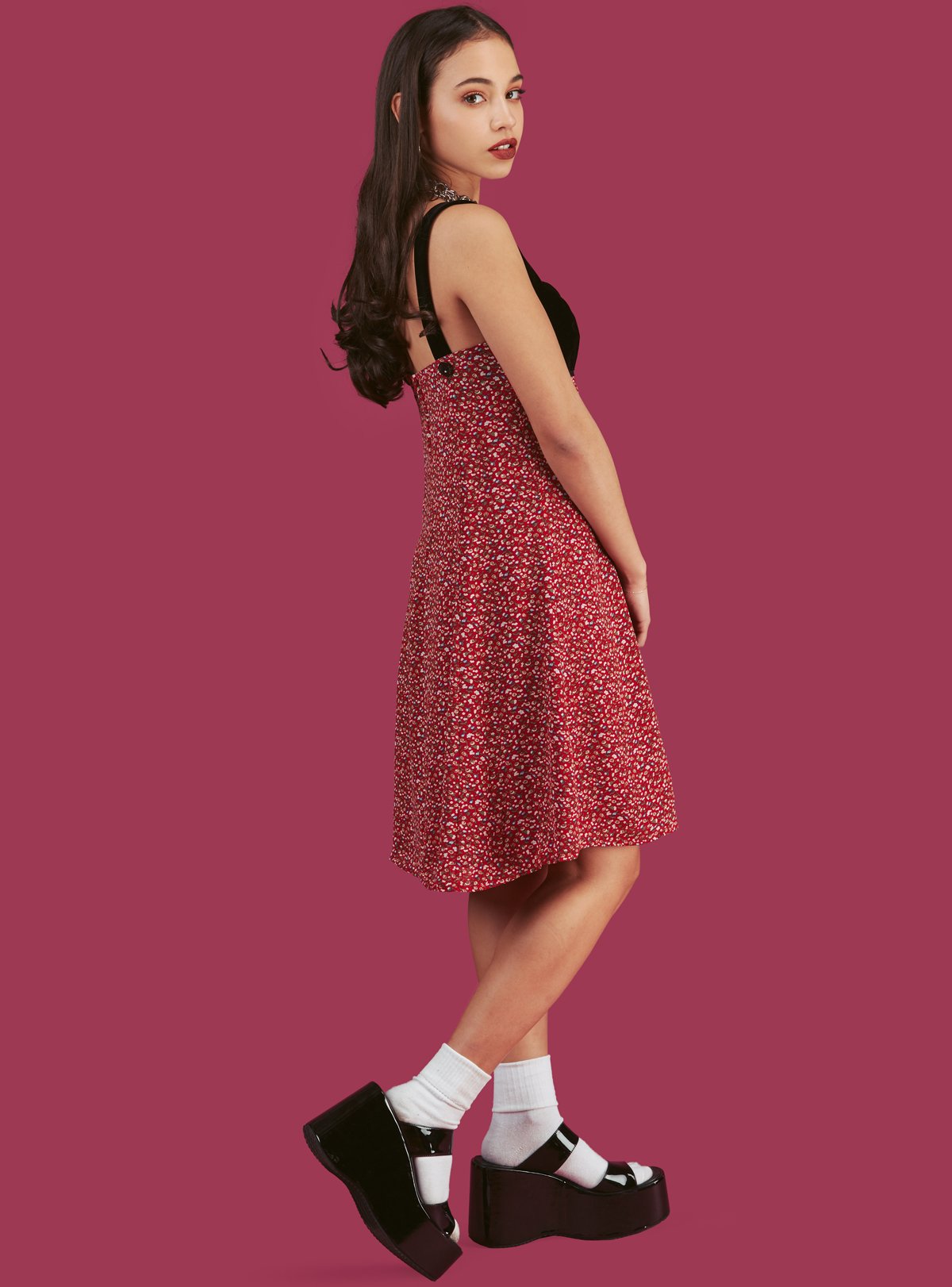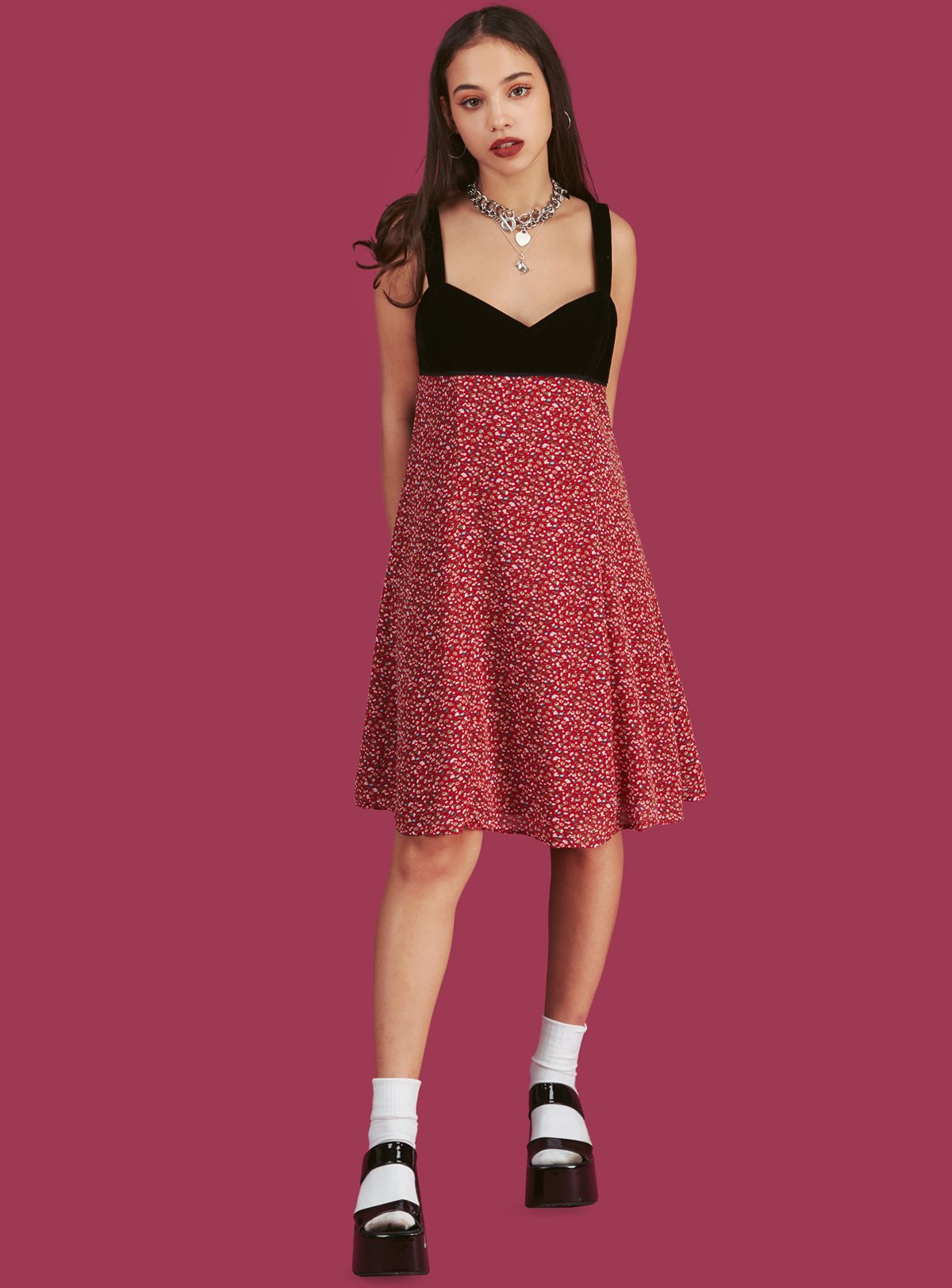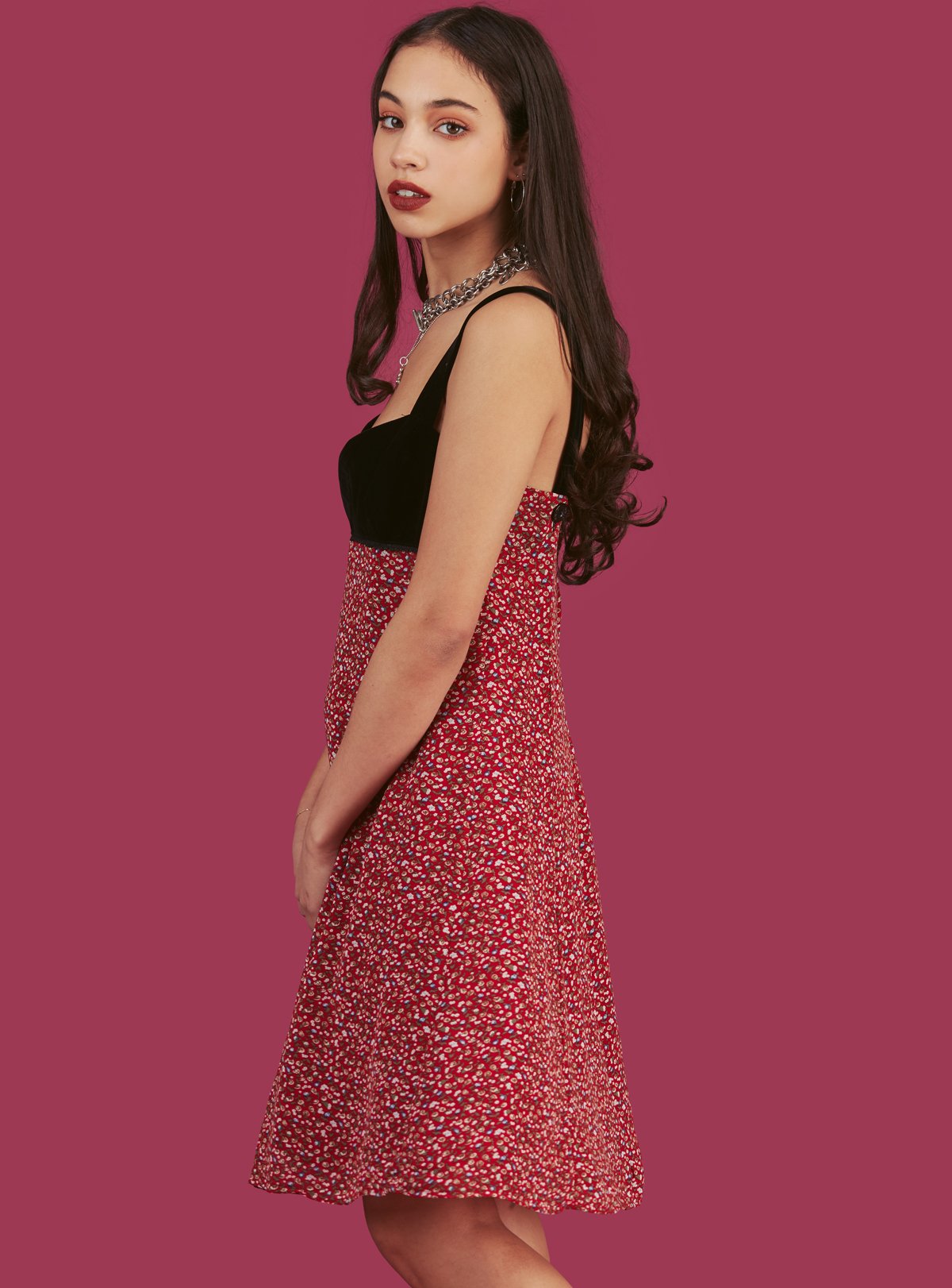 Knee-length dress with velveteen upper portion (has lining) and button detailing where the shoulder straps meet the back. Floral pattern on the bottom.