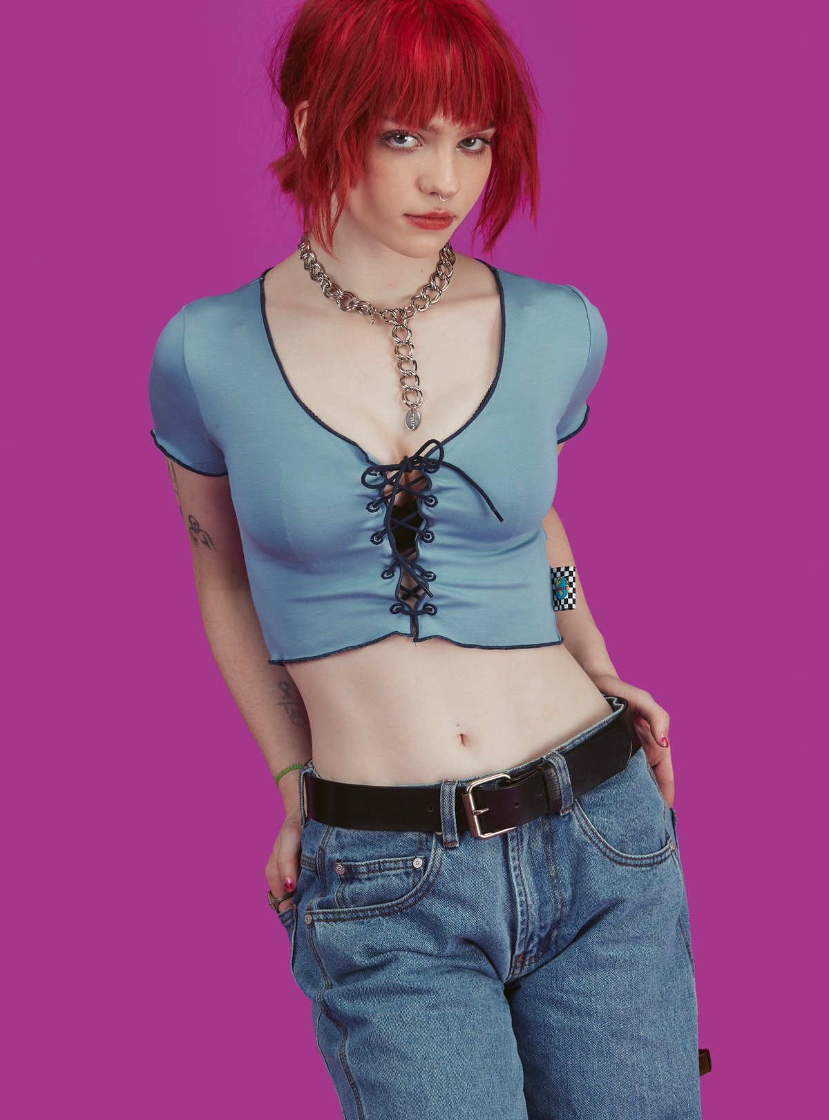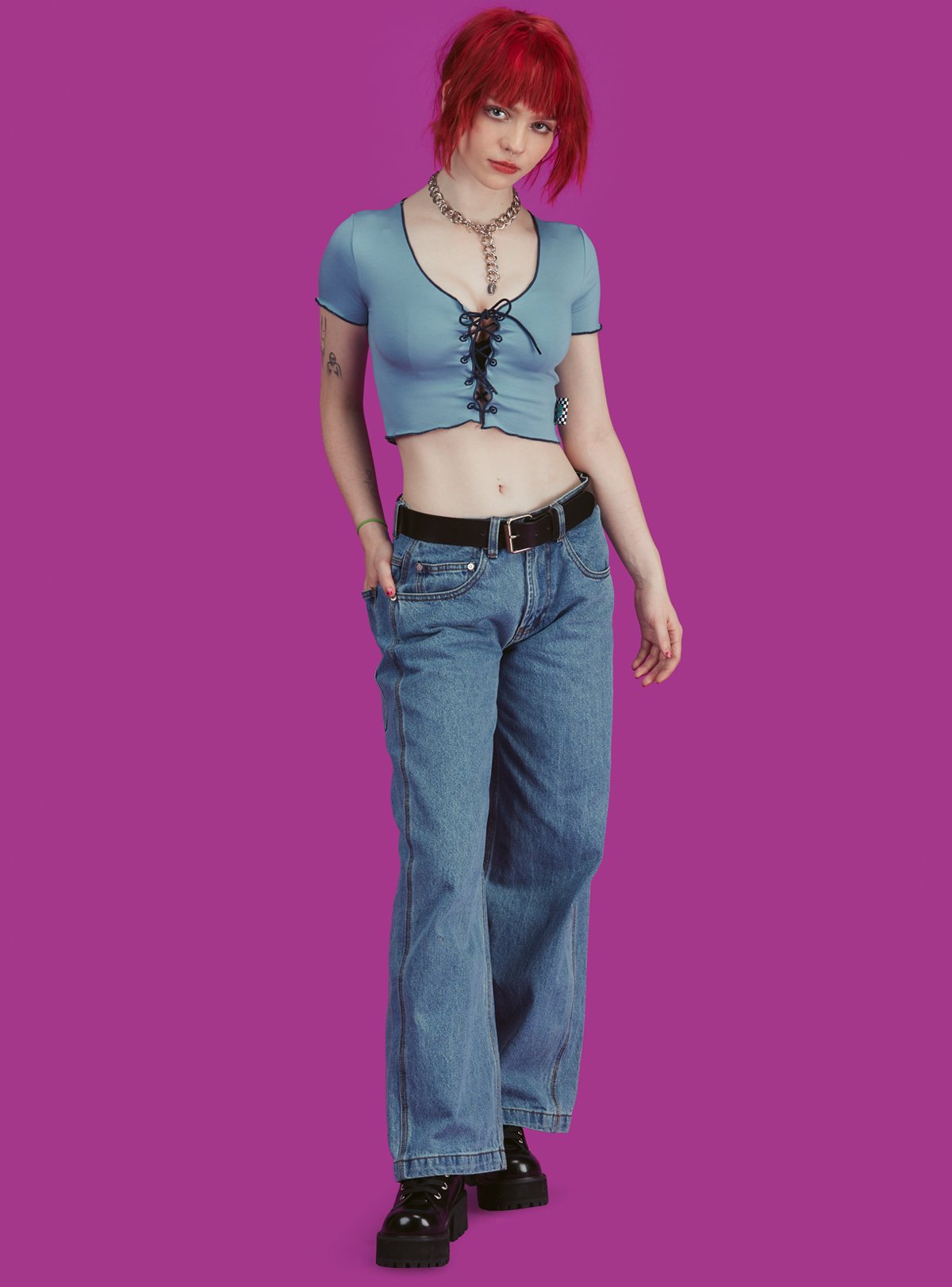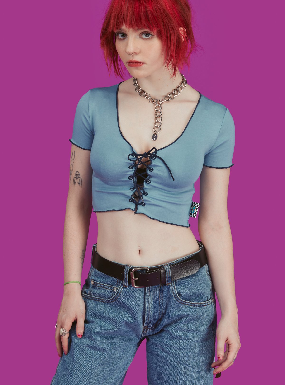 Lace up front top with contrast trim throughout. Cropped fit with a bit of stretch for a comfy, flattering fit.